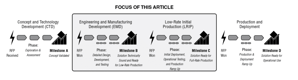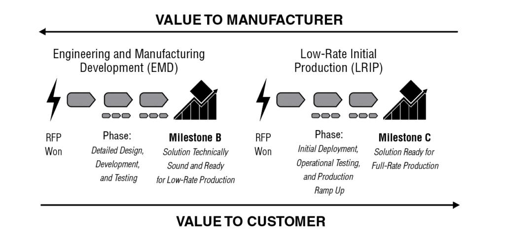 Our example focuses on the OVS that includes the Engineering and Manufacturing Development (EMD) and Low Rate Initial Production (LRIP) phases, since the result of these phases is a system that has an initial capability that has been fielded to the customer. By treating these phases as one value stream, we include manufacturing as part of the end-to-end value stream, enabling the optimization of the flow of value between design, development, and manufacturing.