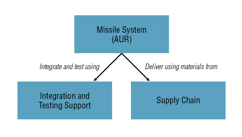 In this step, we identify the solutions that support/enable the operational value stream (OVS). When identifying the OVS solutions, we want to keep Industrial DevOps Principle #4 top of mind: Architect for Change and Speed. Figure 3 shows three key solutions that support/enable the LRIP Missile operational value stream: the physical missile being produced (commonly referred to as the “All Up Round (AUR)”), integration and testing support, and the supply chain.