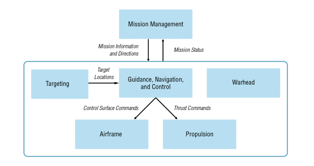 For our example, we take a closer look at the missile system. Figure 4 provides an example of the types of subsystems that make up a missile system. These subsystems reflect a functional decomposition of the Missile System’s operational capabilities. Each subsystem is responsible for providing specific capabilities and for interacting with the other subsystems via specific interfaces, as shown in the diagram. The goal is for each subsystem to be as self-contained as possible with minimal dependencies on other subsystems so it can be iteratively designed, developed, tested, demonstrated, and maintained independently of the rest of the system.