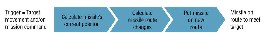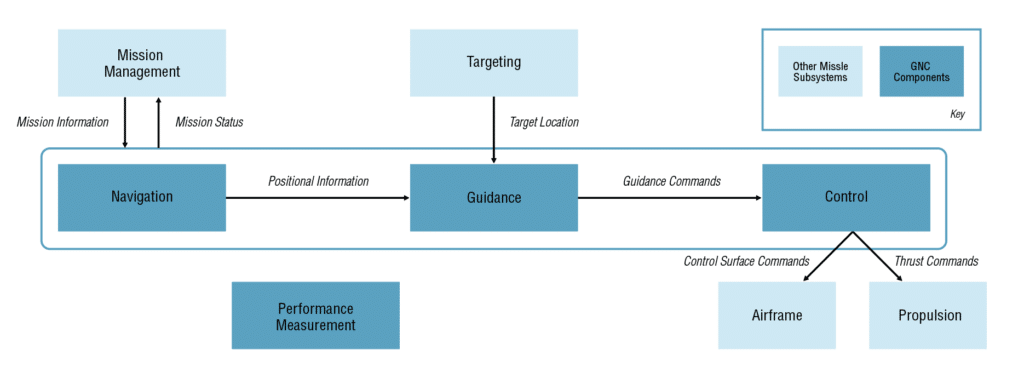 The guidance, navigation, and control (GNC) calculations are triggered by a combination of factors and inputs to ensure accurate and precise flight. The missile’s current position, the target’s current position, environmental conditions, and missile characteristics are used to calculate any route changes needed to steer the missile on the correct path to the target and to make any needed real-time adjustments to the missile’s flight path.
