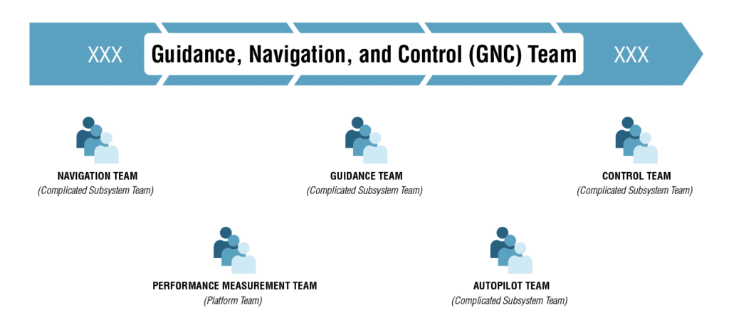 Each of the GNC teams have an associated “team type” as defined in Team Topologies: Organizing Business and Technology Teams for Fast Flow. The complicated subsystem teams have detailed knowledge about the algorithms in specific areas, whereas the platform team provides the platform for evaluating GNC performance. The teams may include suppliers or subcontractors and their contract should reflect how they plan to engage.
