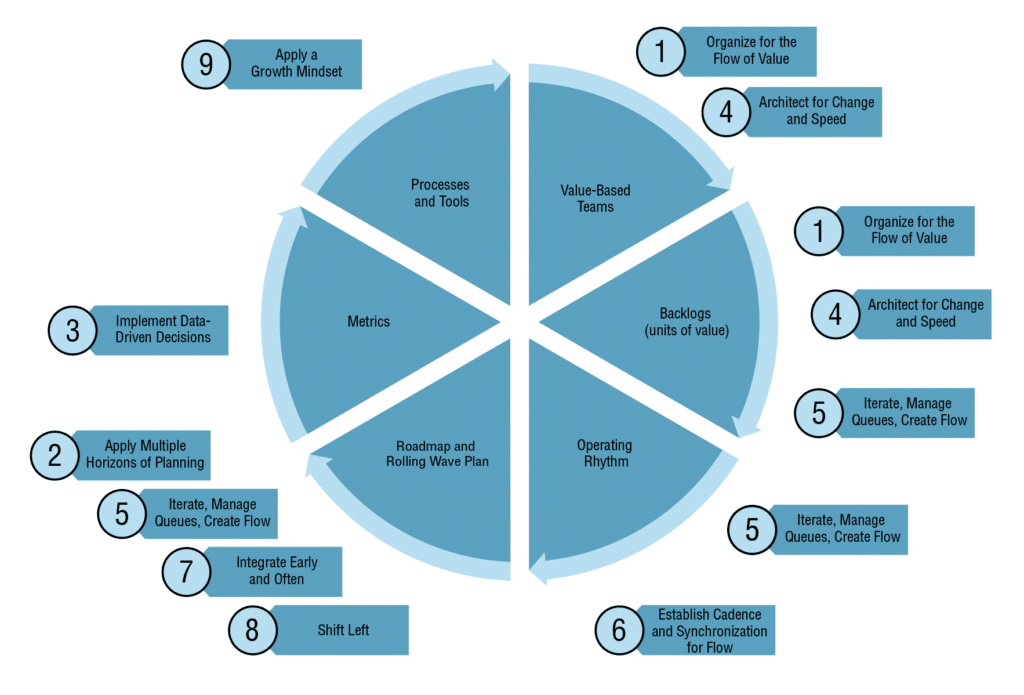 The final step of the process involves implementing a Lean/Agile operating system to coordinate value delivery across teams, enabling experimentation, fast feedback, and flow optimization. In this section, we describe an effective and efficient Lean/Agile operating system whose components support the nine principles of Industrial DevOps as shown in Figure 9.
