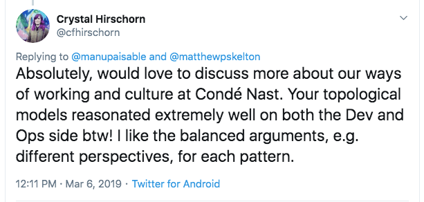 The patterns have also helped global publisher Condé Nast International. Here is Crystal Hirschorn, VP Engineering, describing why they found the patterns useful: