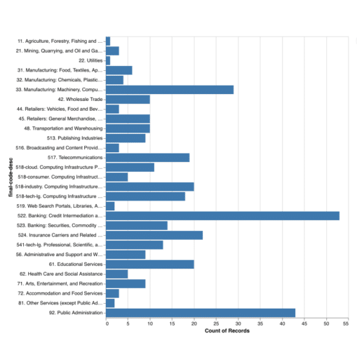 The graph below shows a histogram of the number of companies by industry vertical. I used the NAICS industry codes—this is the North American Industry Classification System published by the US Census. It is the successor to the SIC industry code, which was invented in the 1930s. NAICS is a six-digit hierarchical coding system that specifies industry verticals. The 2-digit form defines broad industry categories, and each additional digit adds even more nuance.