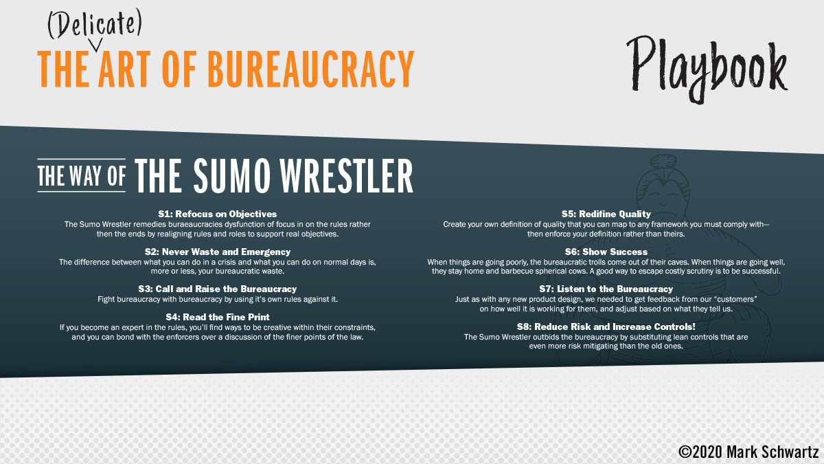 A sumo match can be a delicate balancing of forces, where each wrestler is trying to find exactly the right moment to apply exactly the right amount of force to exactly the right place to get the opponent off balance. Our ally the Sumo Wrestler meets bureaucracy head-on and pushes with the just the right strength at just the right point to win the match.
