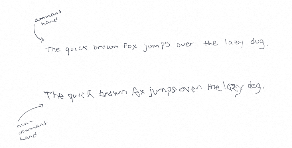 Have you ever tried to write with your nondominant hand? If not, try it now. Grab a piece of paper and a pen, and write the following sentence first with your dominant hand and then your nondominant hand: The quick brown fox jumps over the lazy dog.