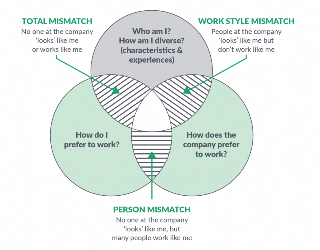 Finding right fit inside a company has three key dimensions. Fit is fully realized when who talent is (all of the characteristics and experiences that make them unique) and how talent prefers to work aligns with what the company values are and how the company works day-to-day. If there is only alignment on two of the three circles, then, at some level, talent is being asked to “fit in.” That feeling of “fitting in” centers around three key misalignments: